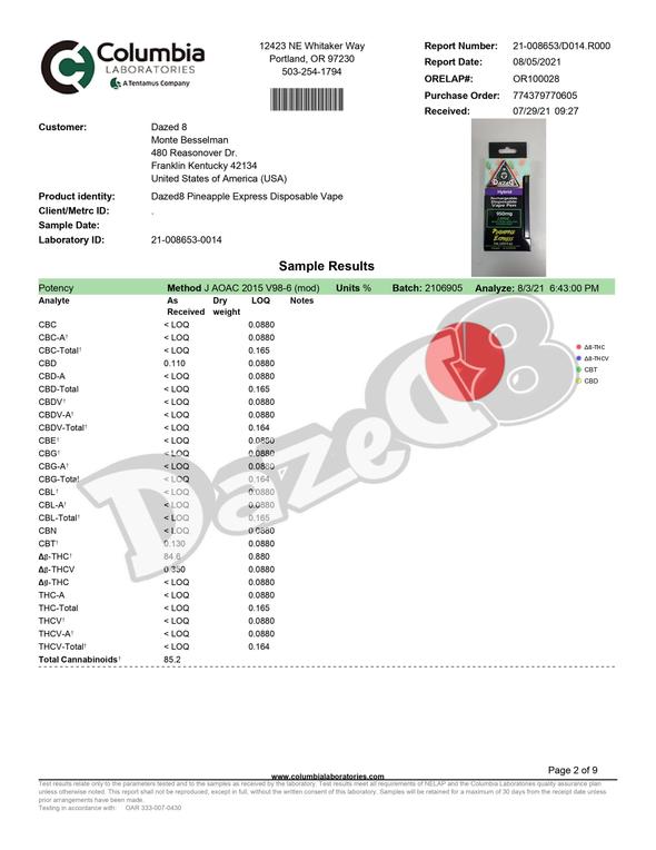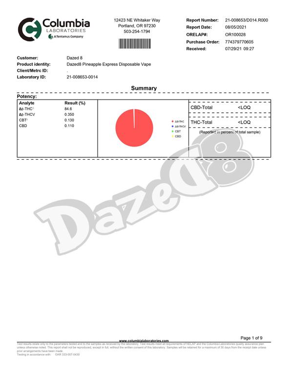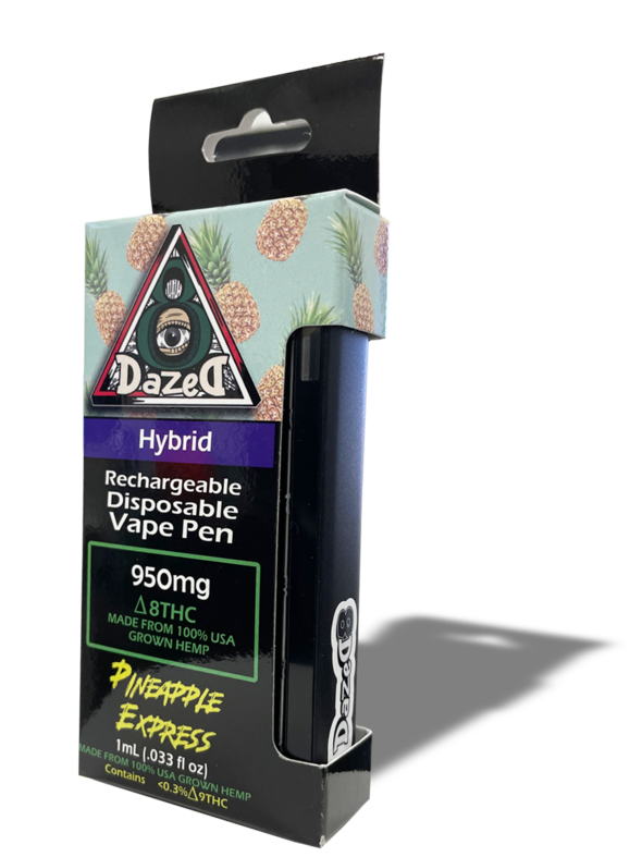 - Rechargeable disposable vape pen filled with 950mg of D8 oil and 50mg of custom formulated botanical terpenes.